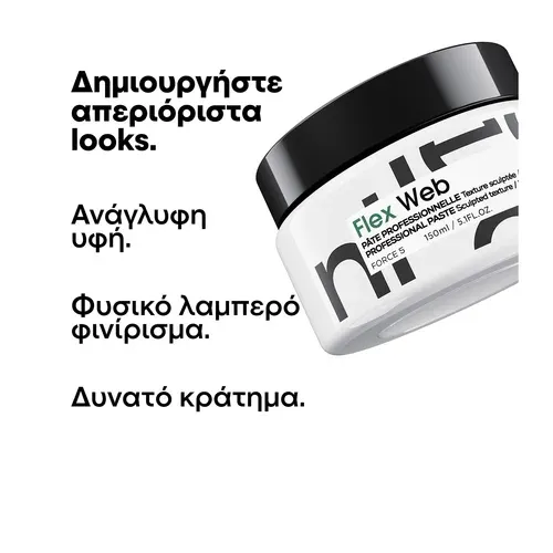 L΄Oreal Professionnel Tecni Art Flex Web Πάστα Διαμόρφωσης είναι μια πάστα styling για σμίλευση μεγάλης διάρκειας, σχηματισμό και definition των μαλλιών, με φυσική λάμψη. Δομημένα ή ατημέλητα looks, καθορισμένες τούφες & φυσικό λαμπερό φινίρισμα.
