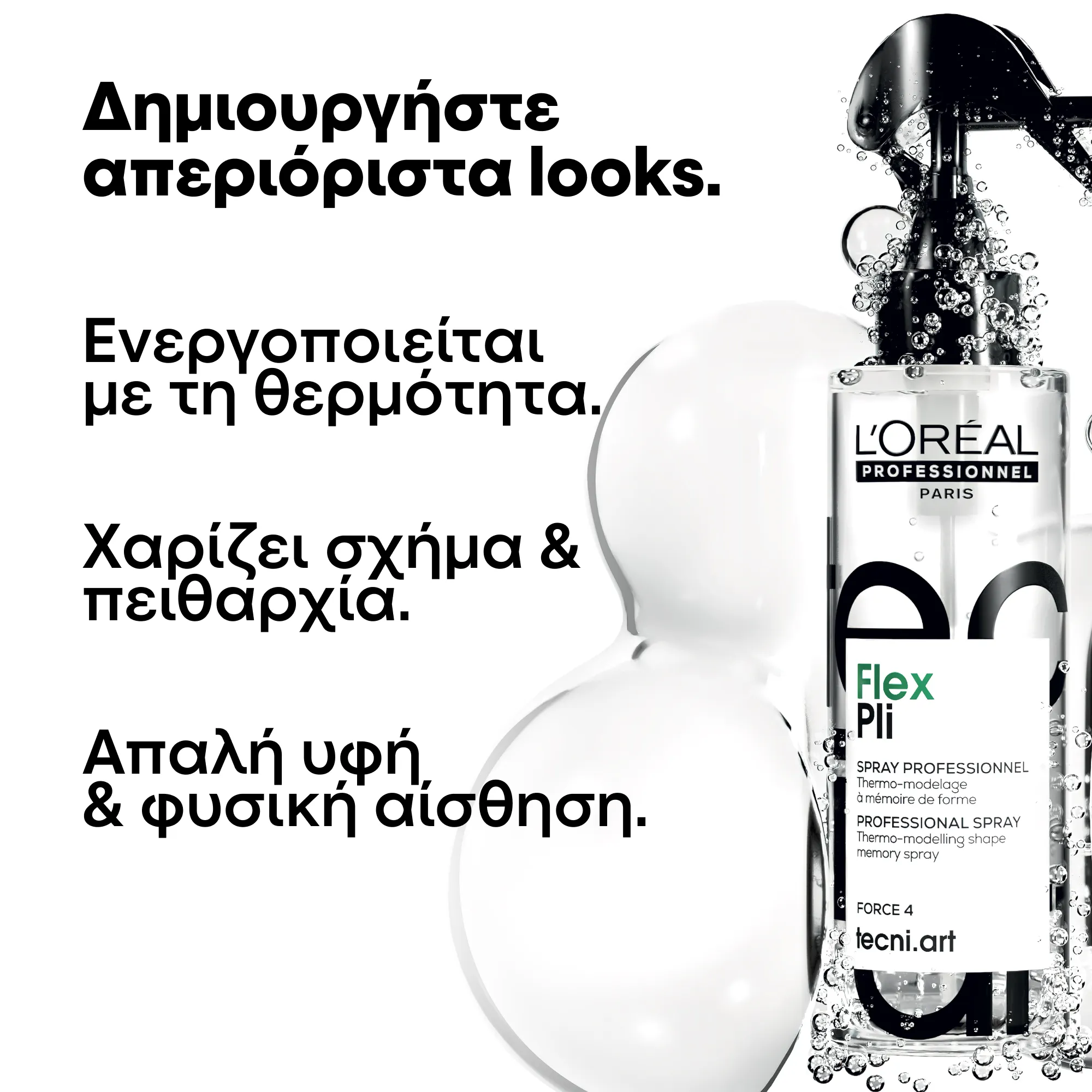 L’Oréal Professionnel Tecni Art Flex Pli Spray Θερμοπροστασίας Μαλλιών ενεργοποιείται με τη θερμότητα, που χαρίζει όγκο και κράτημα. Προσφέρει σχήμα και πειθαρχία στην τρίχα, με μια απαλή υφή και φυσική αίσθηση. Για πιο δημιουργικά looks χρησιμοποιήστε το προϊόν με ένα εργαλείο θερμότητας. Ανασηκώνει άμεσα τις ρίζες και χαρίζει ανάλαφρες μπούκλες ή κυματιστά χτενίσματα.